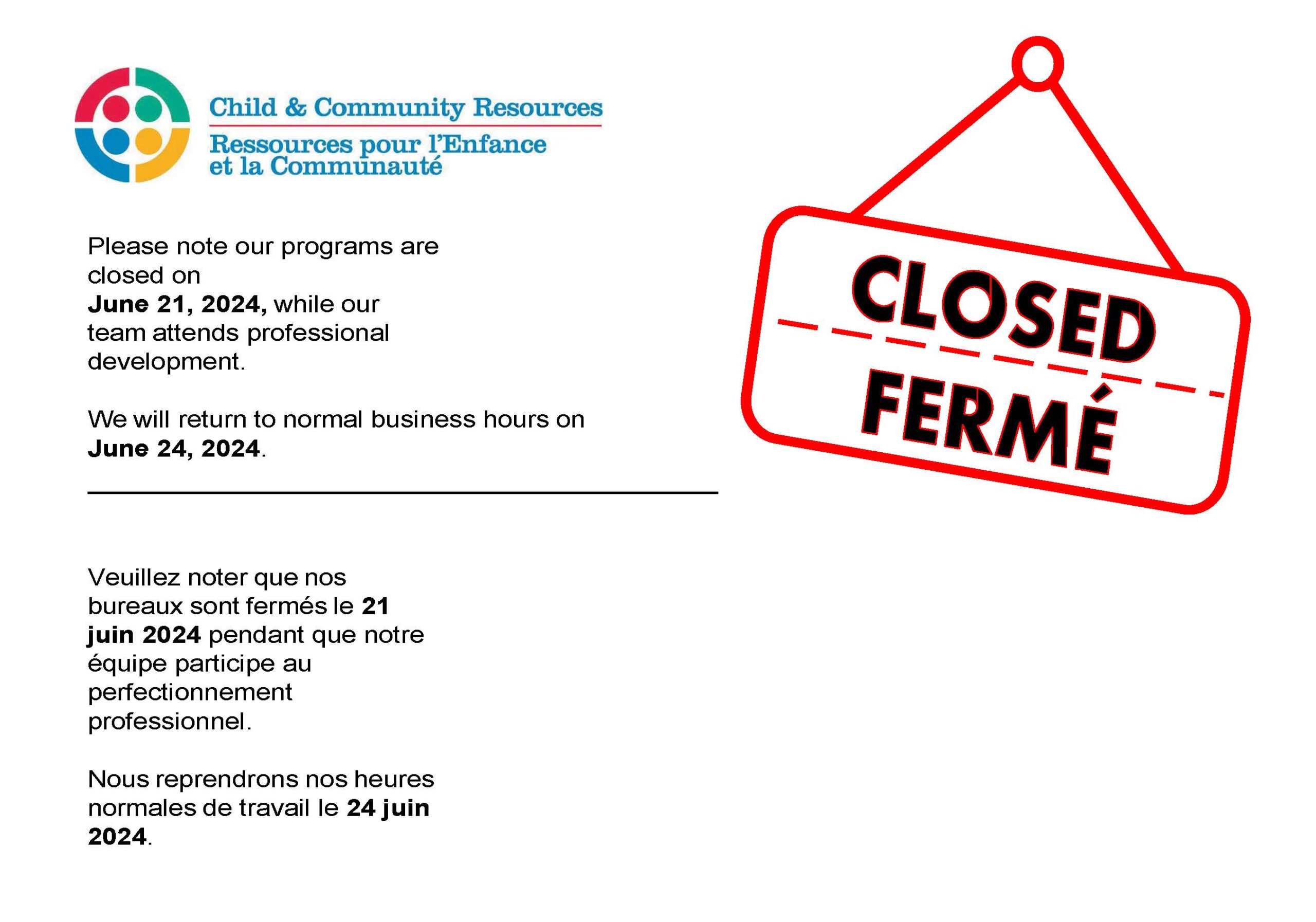 Closed for professional development / Fermé pour développement professionnel